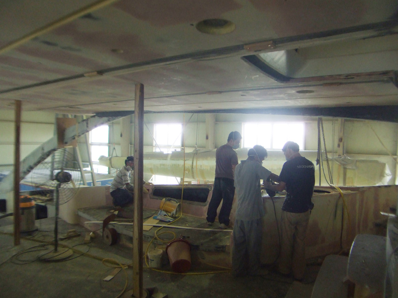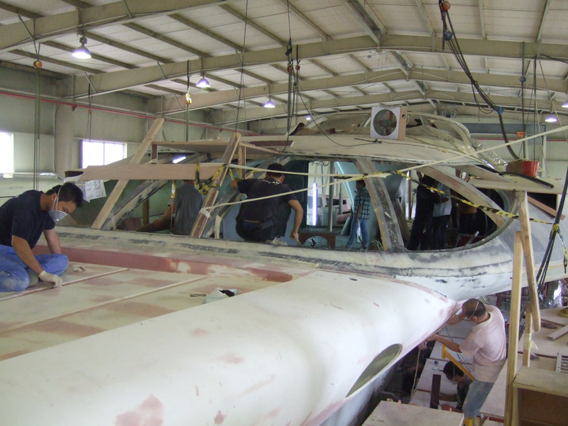 The Superstructure is carbon fibre with Nomex honeycomb core, the hull is Glass/Kevlar foam sandwich and the interior is light weight oak cabinetry using honeycomb panels. To help reduce weight, virtually every aspect of the boat is custom built. This includes carbon fibre hatches, portlights, ladders and even hinges, which are all built specifically for the vessel.